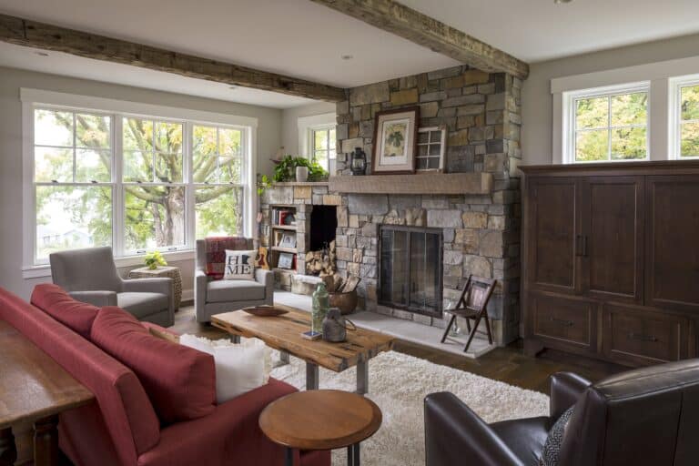 A modern living room often centers around clean architectural lines and understated décor. Adding a reclaimed wood fireplace mantel introduces just the right amount of character without disrupting the simplicity of the space.